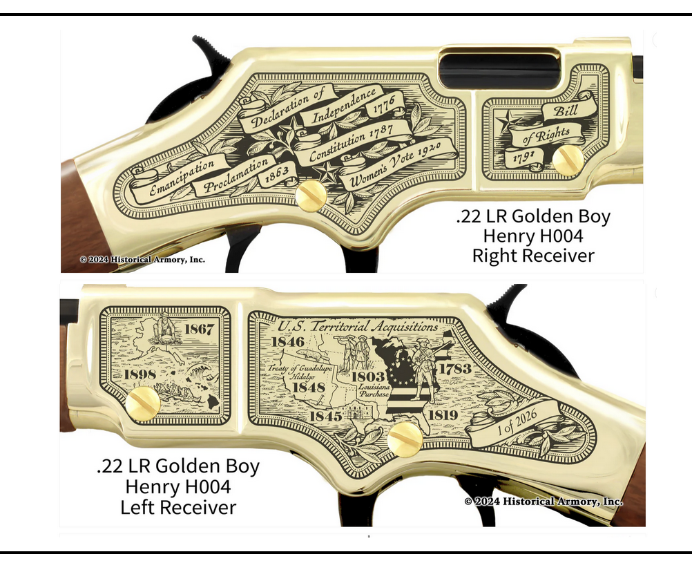 Celebrate our country’s rich history with America’s 250th Anniversary Limited Edition, featuring original artwork and highly-detailed laser engraving, proudly produced only by Historical Armory. Artwork for this special limited edition highlights pivotal moments, inspiring icons, and influential documents that have been a part of shaping our great country. This unique edition is engraved on the affordable, American-made Henry .22 LR Golden Boy H004 model. Take advantage of this opportunity to commemorate America’s 250th birthday!